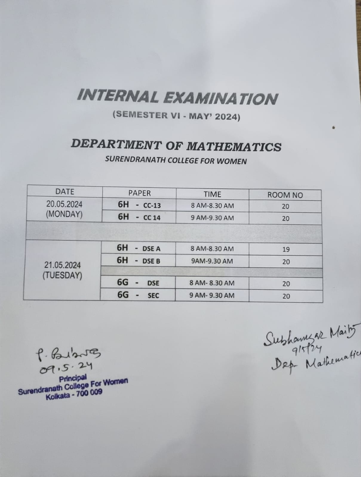 Notice for Internal Examination (Department of Mathematics Sem-IV) on May 9, 2024 in College Notice, Examination Notice