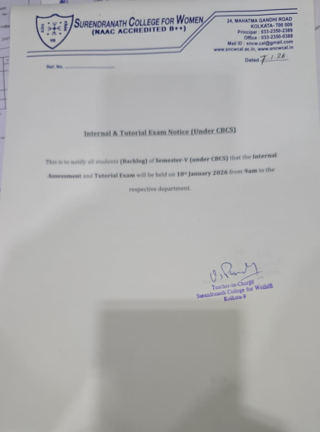 Notice for Internal & Tutorial Exam Notice (Under CBCS) on Jan 7, 2026 in Admission Notice, College Notice, Examination Notice, Program and Events