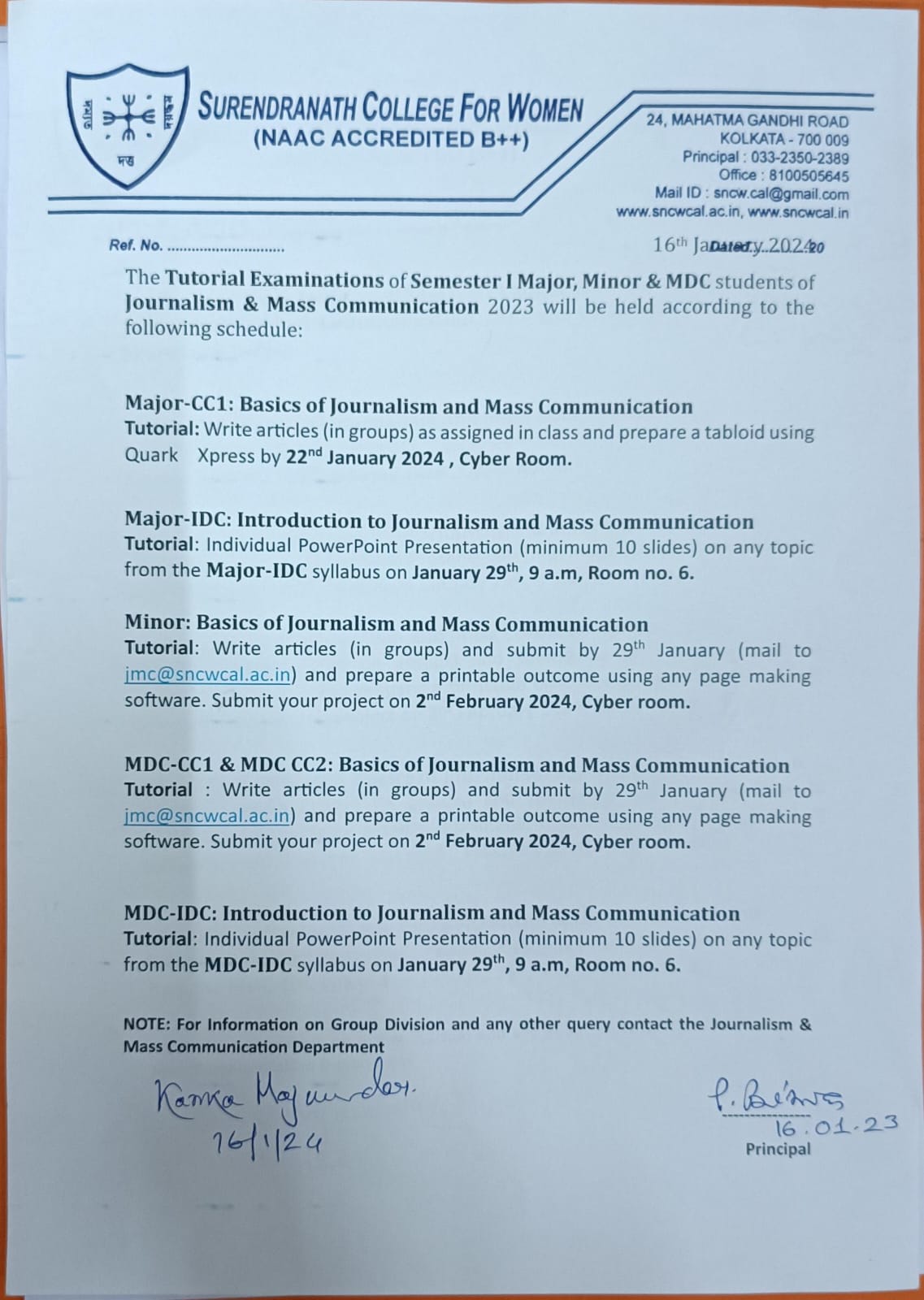 Notice regarding tutorial examinations of semester 1 Major,Minor & MDC Student on Jan 16, 2024 in College Notice