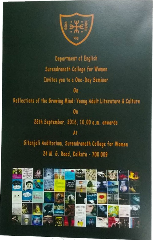 Reflections of the Growing Mind: Young Adult Literature and Culture Organised by the Department of English, Surendranath College for Women Venue: Gitanjali Auditorium, Surendranath College for Women, 24 M.G. Road, Kolkata 700009. Time: 10 am to 4 pm The Department of English, Surendranath College for Women is going to organize a seminar on Young Adult Literature. The seminar is an attempt to understand the ways in which Young Adult Literature has developed over the years as a distinct type of literature, and the possibilities it offers as an area of scholarly research. Concept Note Young Adult Literature across the world has always been unique because of the diversity of its readership. Originally written for adolescent readers, literary works of this kind never fail to appeal even to adult readers. On the one hand, these works bear traces of the deceptive simplicity of children’s literature; on the other hand, they manifest the hardened cynicism of adult fiction. This inherent dualism of young adult literature makes them intriguing. Besides, young adult literature opens up a wide scope for critical observation of its target-readers—the adolescents, who, being on the verge of adulthood, experience phenomenal changes in their perceptions.