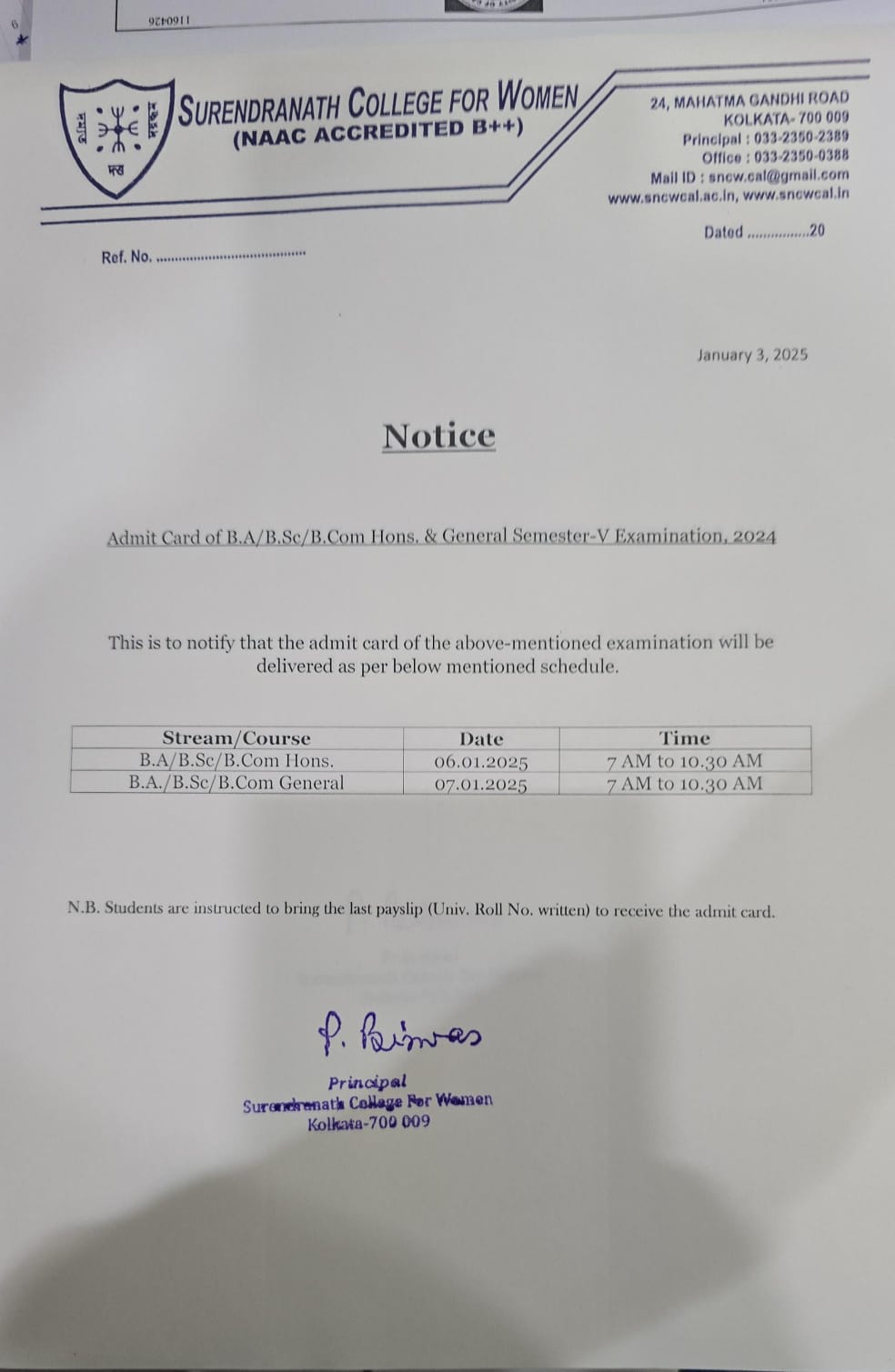 Notice for Admit Card delivered for semester-V Examination on Jan 3, 2025 in College Notice, Examination Notice
