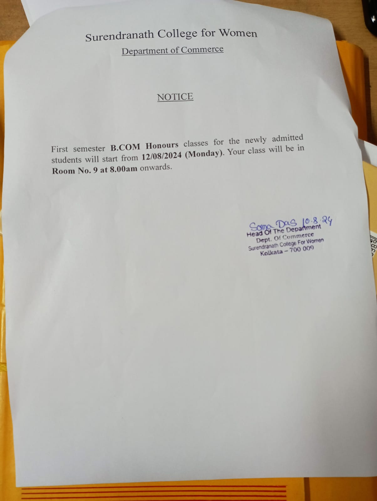 Notice – 1st Semester B.COM Honours Class for Newly Admitted Students