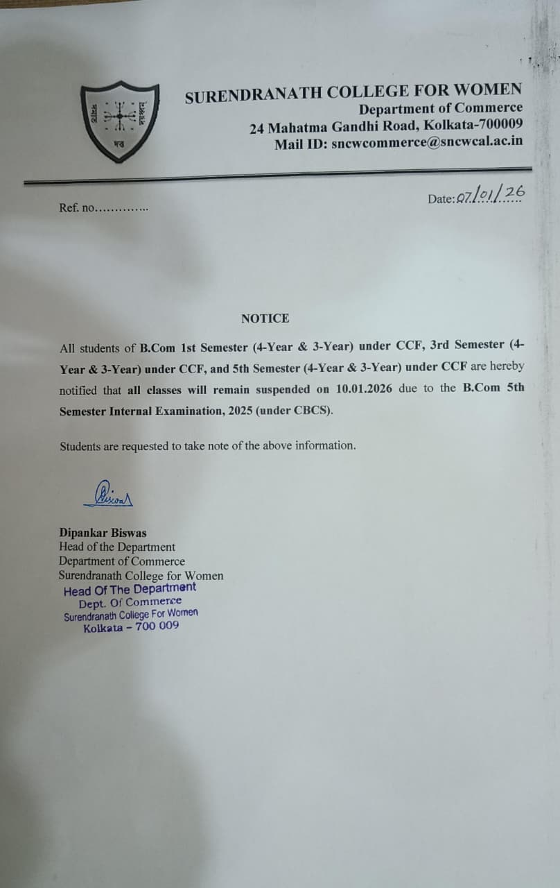 Notice for Classes will remain suspended B.Com 1th,3rd & 5th Semester (4-Year & 3-Year) Student on Jan 7, 2026 in Admission Notice, College Notice, Examination Notice, Program and Events