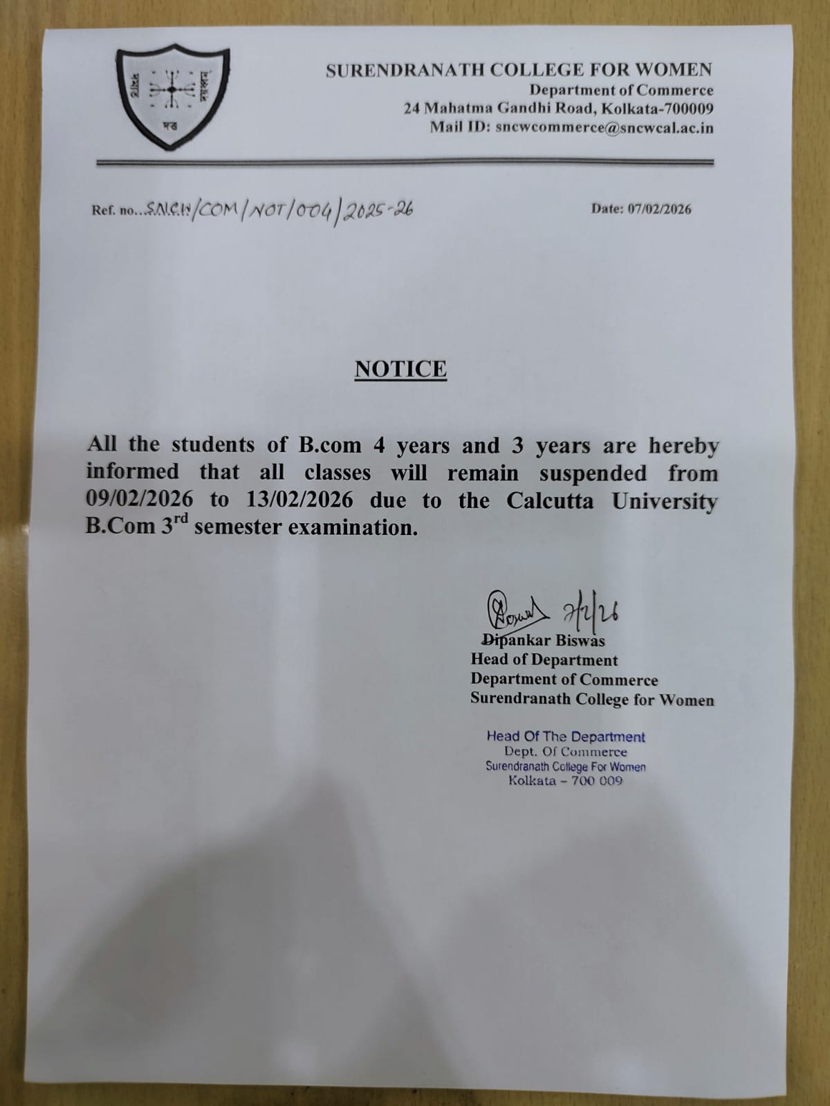 Notice for classes will remain suspended of B.Com 4 Year and 3 year on Feb 7, 2026 in Admission Notice, College Notice, Commerce, Examination Notice, Program and Events