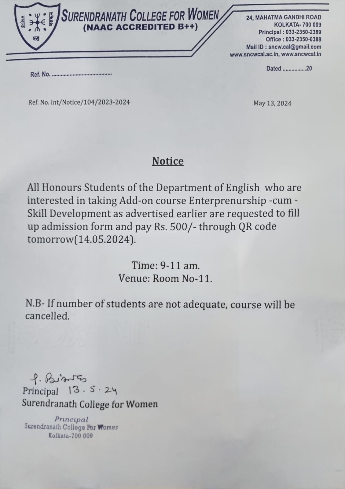 Notice for English Honours Students for Admission Form Fill Up on May 13, 2024 in Admission Notice, College Notice
