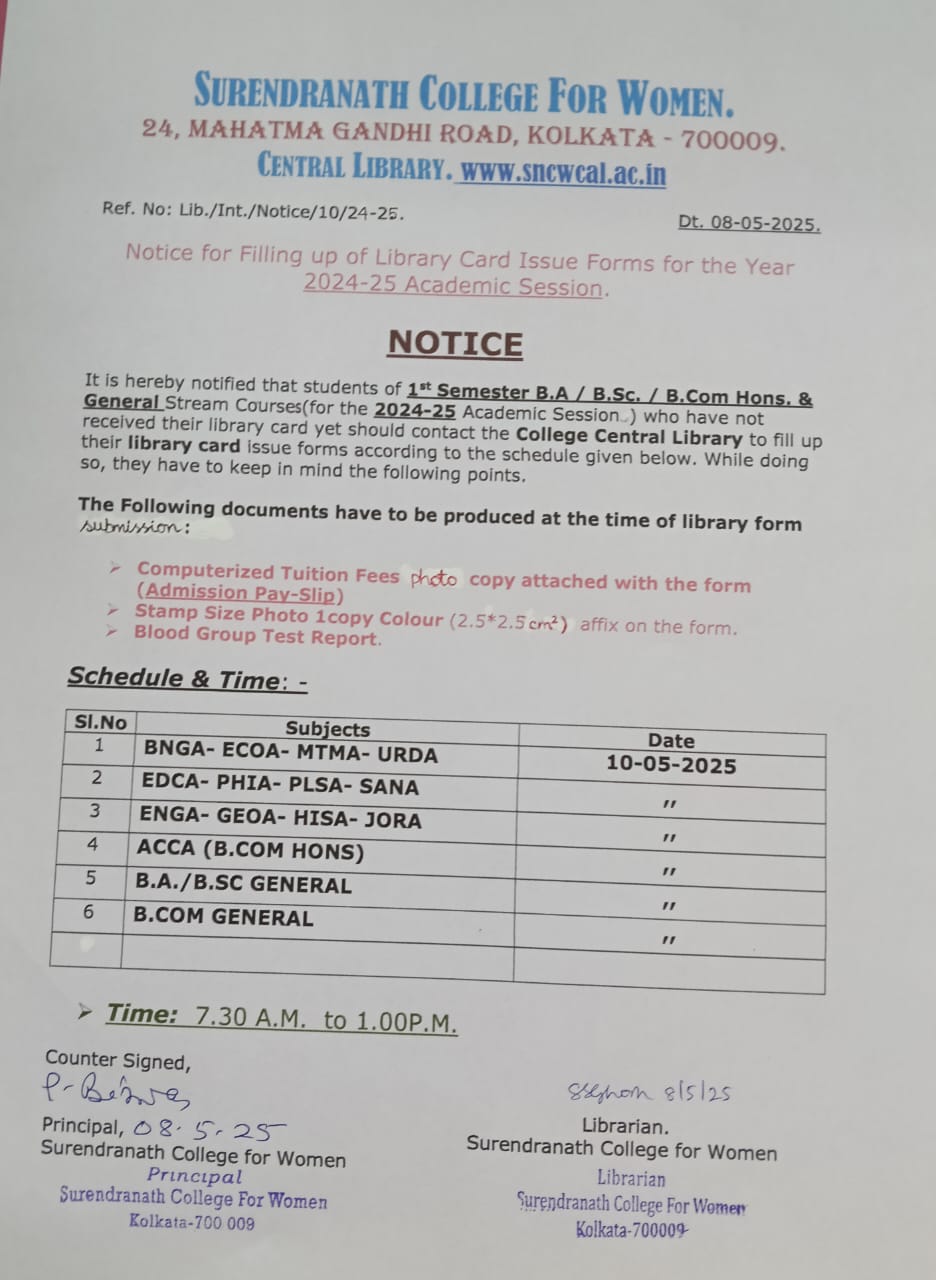 Notice for Filling up of Library Card Issue Forms for the Year 2024-25 Academic Session on May 8, 2025 in College Notice