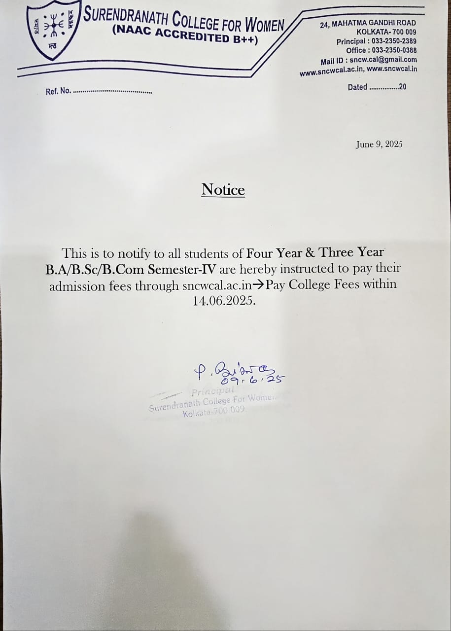 Notice for payment of admission fees Semester IV Students on Jun 9, 2025 in Admission Notice, College Notice