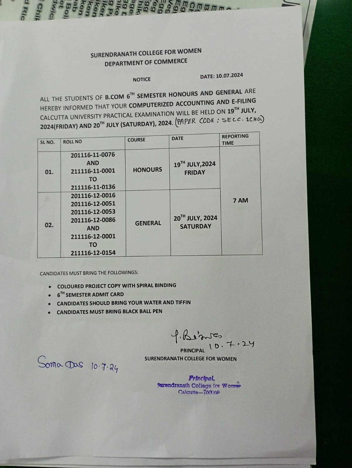 Notice for Practical Examination B.Com 6th sem Honours and General (Computerized Accounting and E-Filing) on Jul 10, 2024 in Admission Notice, College Notice, Examination Notice