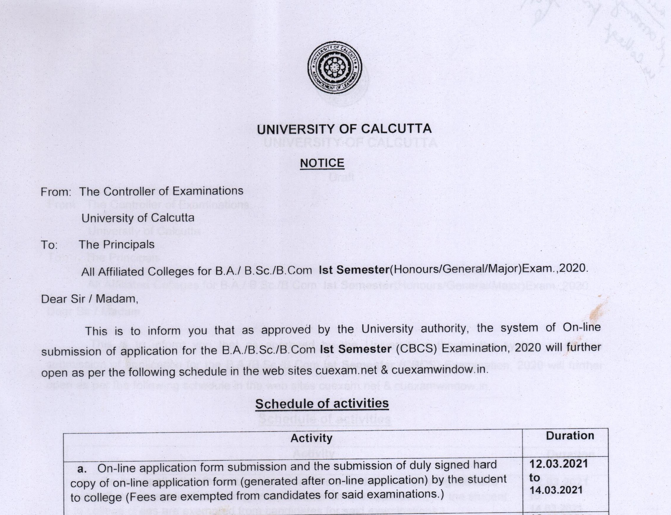This is to notify those who missed the online form fillup of Semester-I are instructed to submit the form as per the following schedule. It is mandatory to submit the hard copy of the form at the earliest to college.