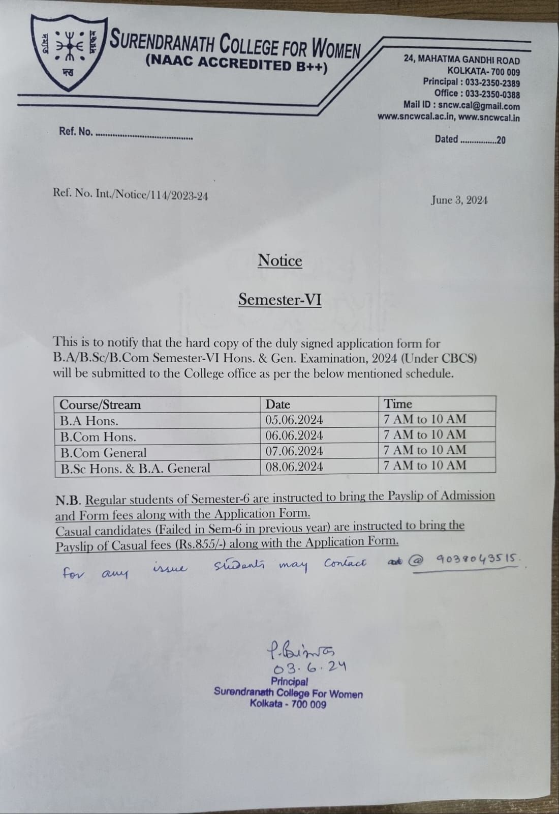 Notice for Semester-6 Examination form submission on Jun 3, 2024 in Admission Notice, College Notice Notice for Semester-6 Examination form submission