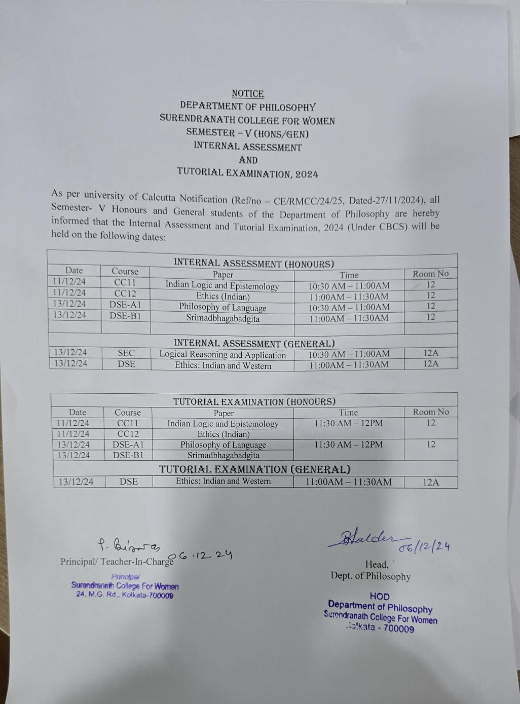 Notice for semester-V (Honours and General) Internal Assessment and Tutorial Examination, 2024 on Dec 6, 2024 in College Notice