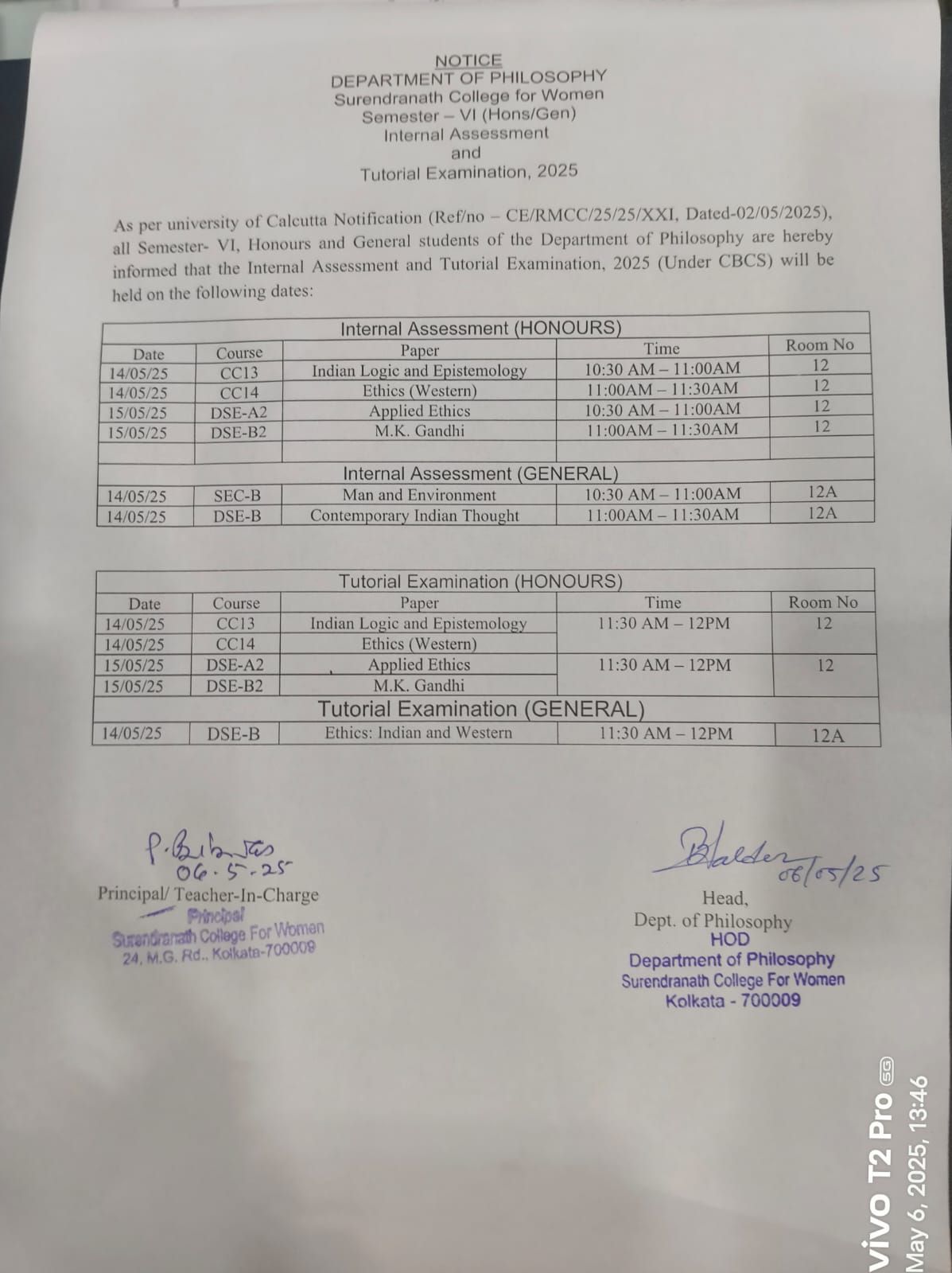 Notice for semester-VI (Hons/Gen) Internal Assessment and Tutorial Examination-2025 on May 6, 2025 in College Notice