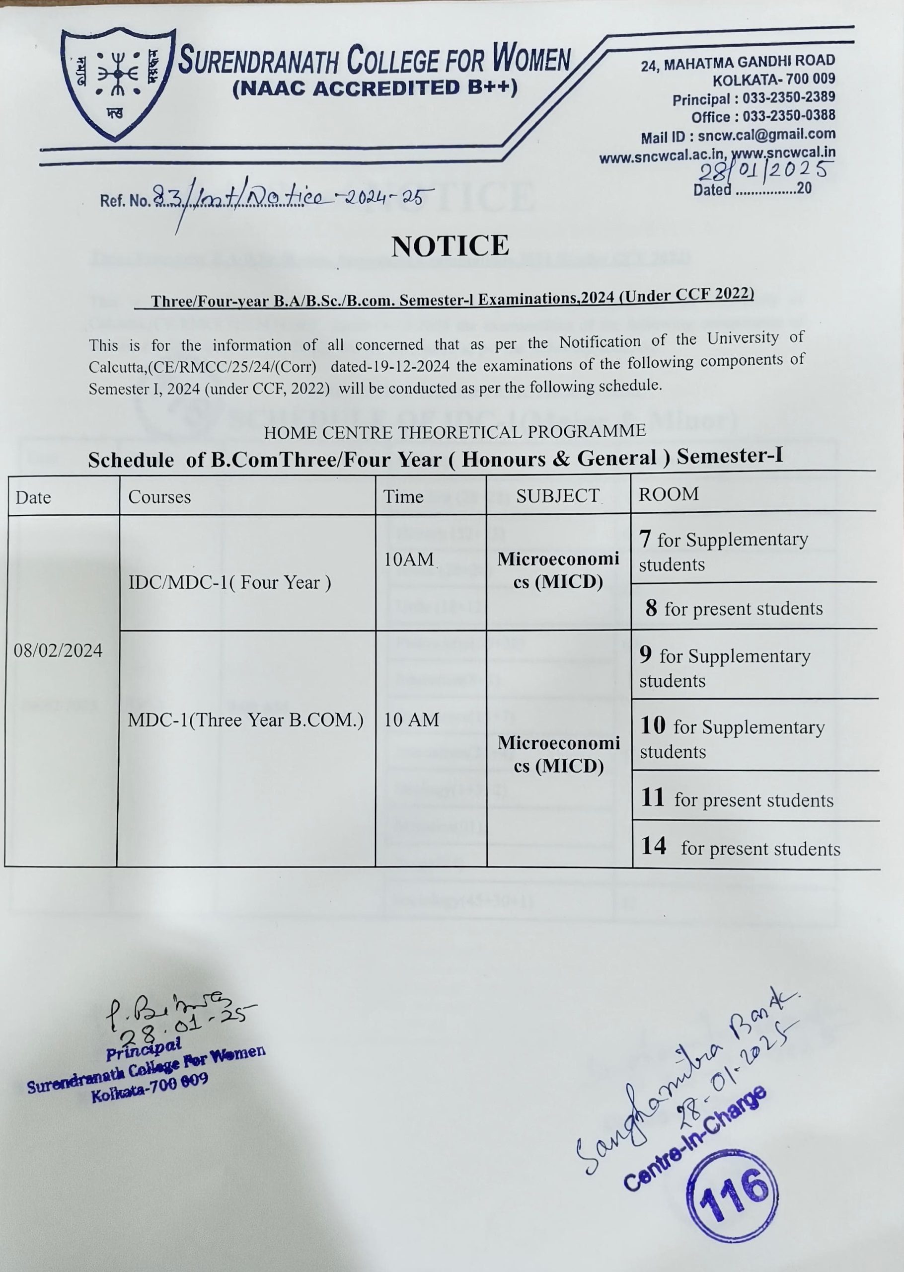 Notice for three/four year B.A/B.Sc/B.Com Semester-I Examination,2024 (Under CCF 2022) on Jan 28, 2025 in College Notice