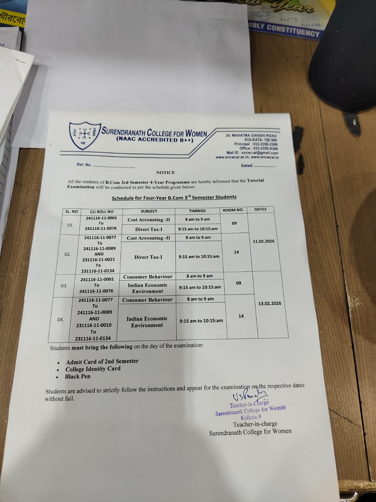 Notice for Tutorial Examination for B.Com 3rd Sem 4 Year Programme on Feb 5, 2026 in College Notice, Commerce, Examination Notice