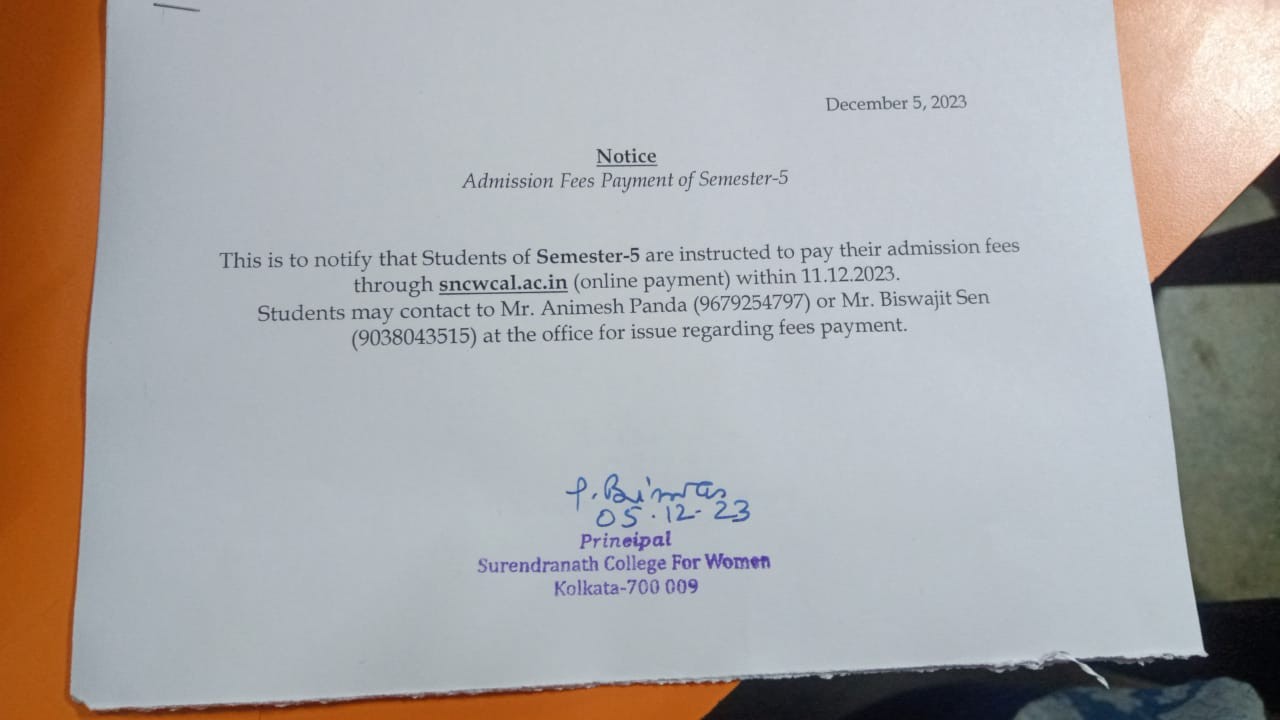 Notice regarding Admission fees payment of semester-5 on Dec 5, 2023 in Admission Notice, Examination Notice